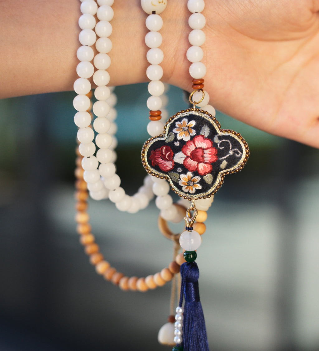 Design Long Style Four-leaf Clover Embroidered Sachet Necklace(White beads)